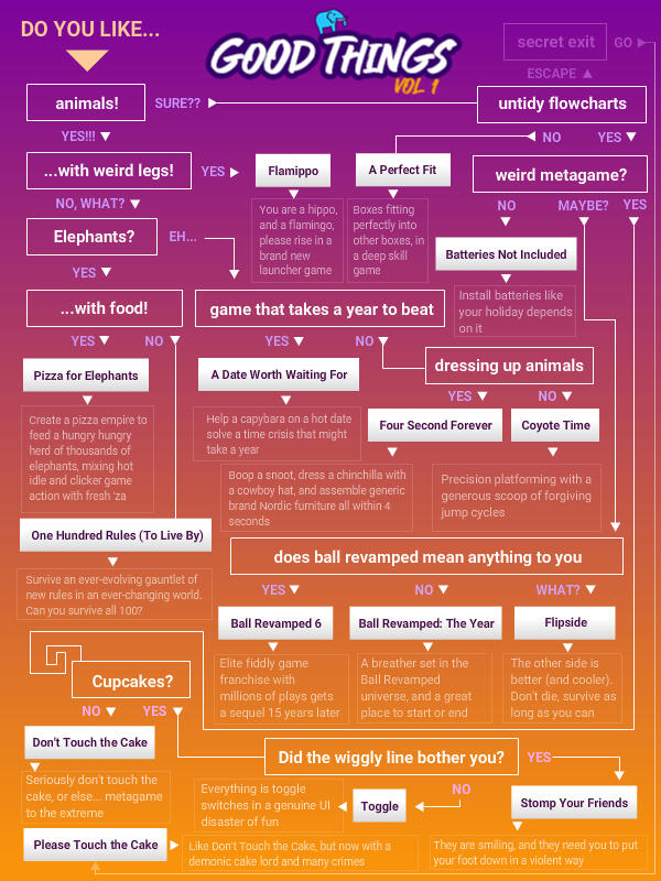 Good Things Vol 1 is a collection of fifteen brand new, wildly imaginative, weird little games lodged deep in the intestinal track of an elephant who didn't know better. From platformers to puzzles to explorations of meta and design, Good Things Vol 1 is all about chasing innovation through the intestinal track of a hungry little elephant.